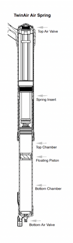 The TwinAir system divides the air chamber in half using a floating piston. There are individual air valves for the top and bottom chambers. If you want your ride to be as plush as possible, add air only to the top. If you want a more progressive feel, begin adding air to the bottom. This moves the floating piston up reducing the size of the air chamber. Remember, you have total control over the movement of the floating piston, so fine-tuning the air spring is a snap! You can even make adjustments on the trail by caring your shock pump. Try that with a token system.