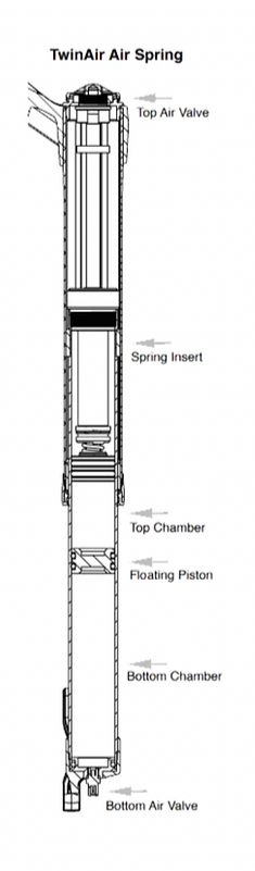 The TwinAir system divides the air chamber in half using a floating piston. There are individual air valves for the top and bottom chambers. If you want your ride to be as plush as possible, add air only to the top. If you want a more progressive feel, begin adding air to the bottom. This moves the floating piston up reducing the size of the air chamber. Remember, you have total control over the movement of the floating piston, so fine-tuning the air spring is a snap! You can even make adjustments on the trail by caring your shock pump. Try that with a token system.