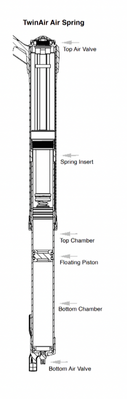 The Wren TwinAir System is designed to fine-tune the ride of the fork using only your air pump. No disassembly of the fork is required. The TwinAir system is similar to the token system used in other suspension forks but is infinitely more adjustable. Tokens are a fixed size and each one you drop-in gives you a jump in the spring rate. The floating piston in the TwinAir system can be moved as little or as much as you want. This allows you to fine-tune the spring rate to exactly match your riding style and trail conditions.