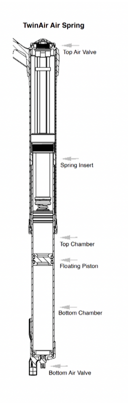 The TwinAir system divides the air chamber in half using a floating piston. There are individual air valves for the top and bottom chambers. If you want your ride to be as plush as possible, add air only to the top. If you want a more progressive feel, begin adding air to the bottom. This moves the floating piston up reducing the size of the air chamber. Remember, you have total control over the movement of the floating piston, so fine-tuning the air spring is a snap! You can even make adjustments on the trail by caring your shock pump. Try that with a token system.
